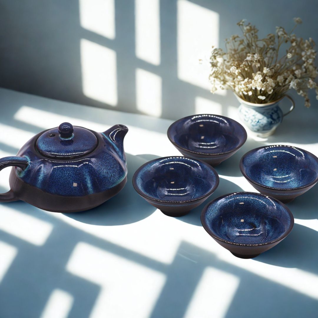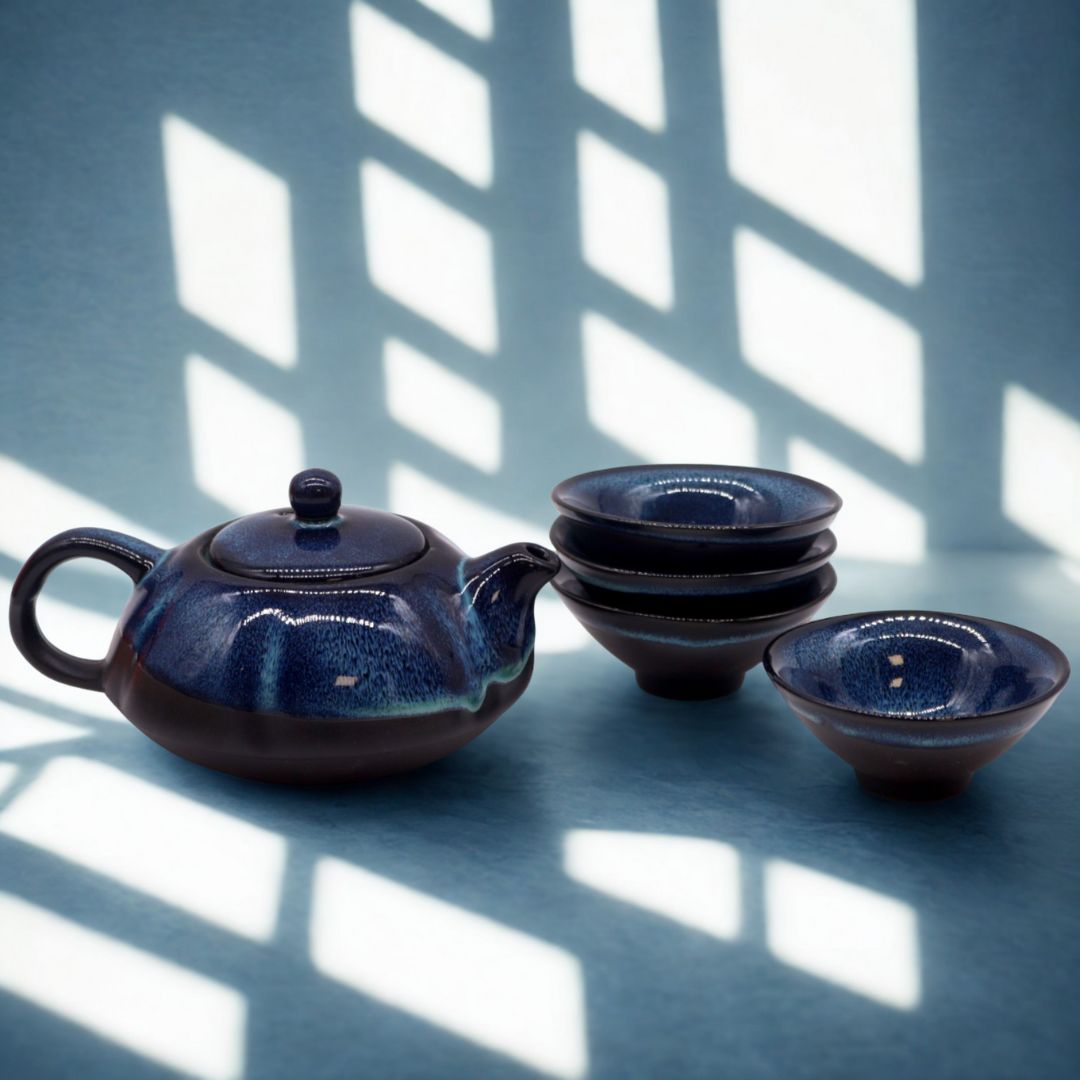 Keraamiline teekann ja neli madalat teekaussi sügavsinise puudutusega. Sobivad hästi nii argipäevaseks kasutamiseks kui ka teadlikeks puhkehetkedeks.